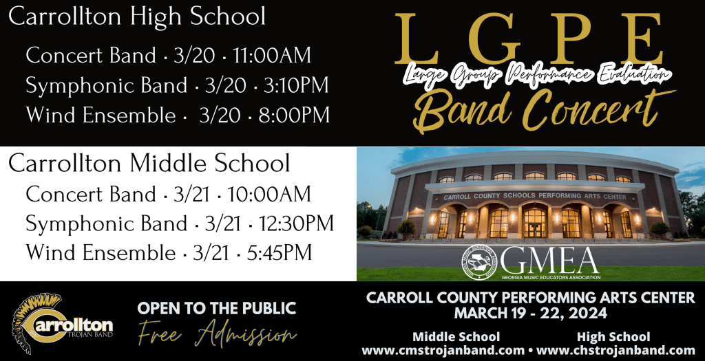 Congratulations to the Carrollton Middle School Concert Band, Symphonic Band, and Wind Ensemble! All three groups performed at the annual state music assessment, entitled “Large Group Performance Evaluation”, on Thursday. They played beautifully for adjudicators and represented our community well. Congratulations on a great performance!