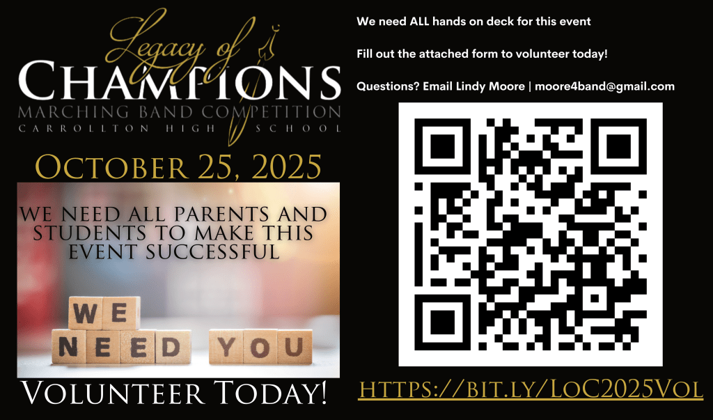 10/25 CHS Band Legacy of Champions Marching Competition: Student & adult volunteers needed! Volunteer here